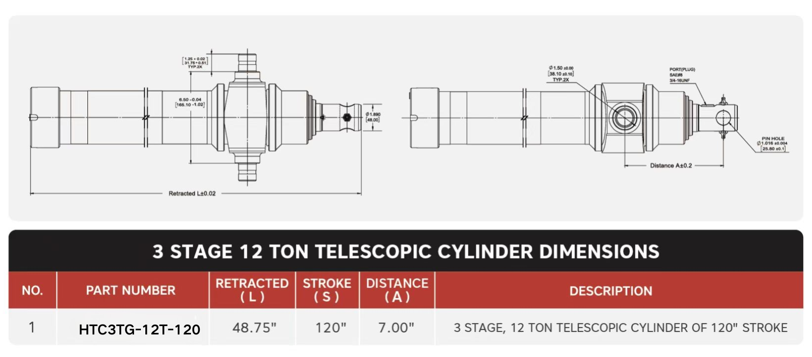 "HTC3TG-12T-120", 3 Stage, 12 Ton Of 120" Stroke Cylindri Telescopic