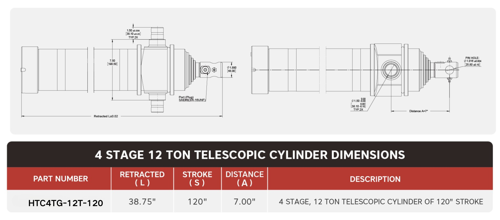 "HTC4TG-12T-120", 4 Stage, 12 Ton Of 120" Stroke Cylindri Telescopic