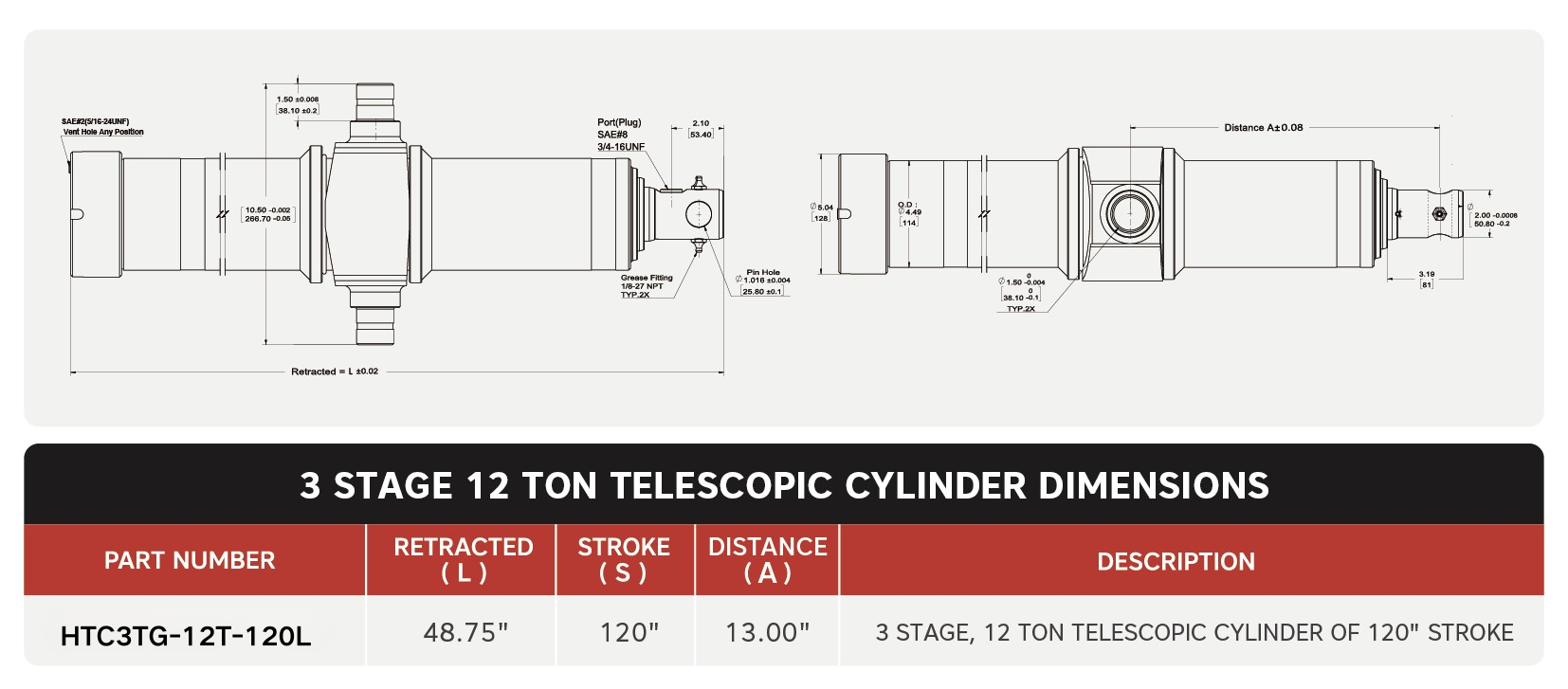 "HTC3TG-12T-120L", 3 Stage, 12 Ton Of 120" Stroke 13" Trunnion Distantia Cylindri Telescopici